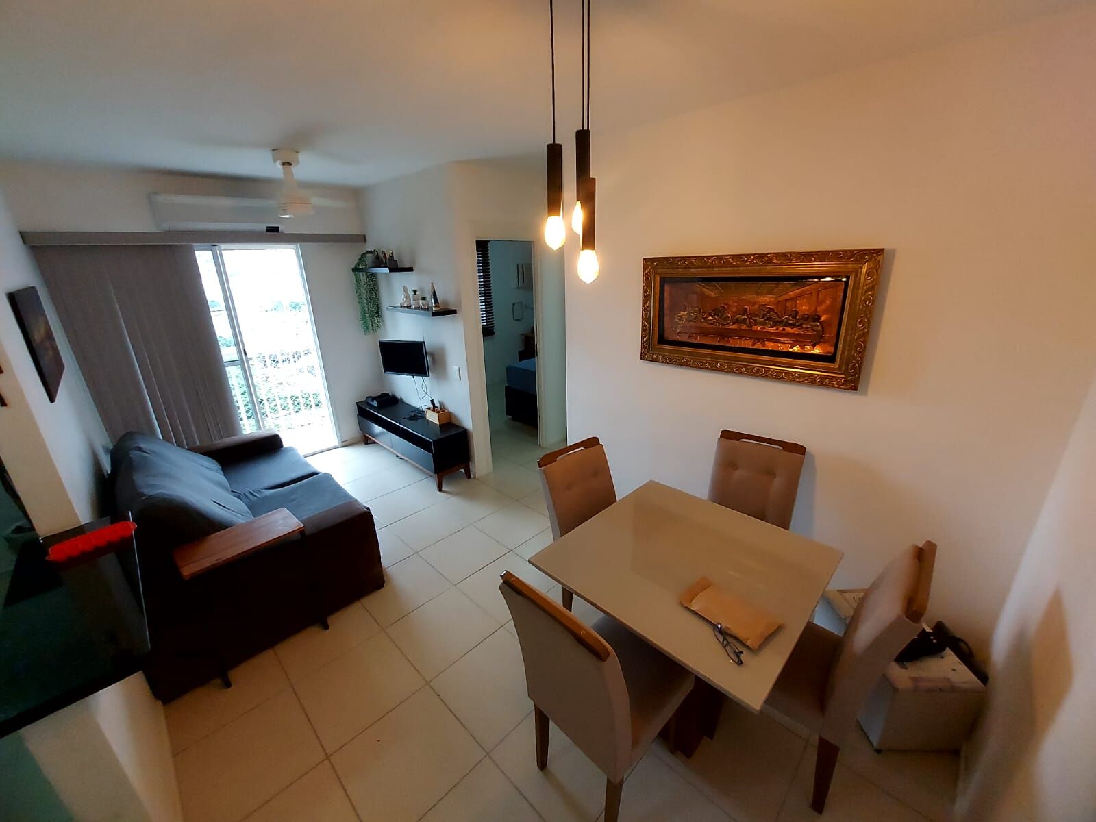 Apartamento de 2 quartos (1 suíte), sala grande com 2 ambientes, varanda integrada a sala, cozinha com área de serviço e vaga de garagem.